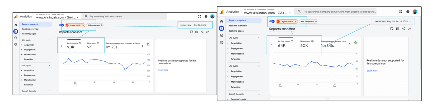 The Kris Lindahl website has recently been migrated over to Sierra Interactive from a custom-built platform when we started working together. Our goals were to continue reformatting and optimizing existing content for the new Sierra Interactive template, while also increasing organic traffic, visibility, and lead generation at a high-level.