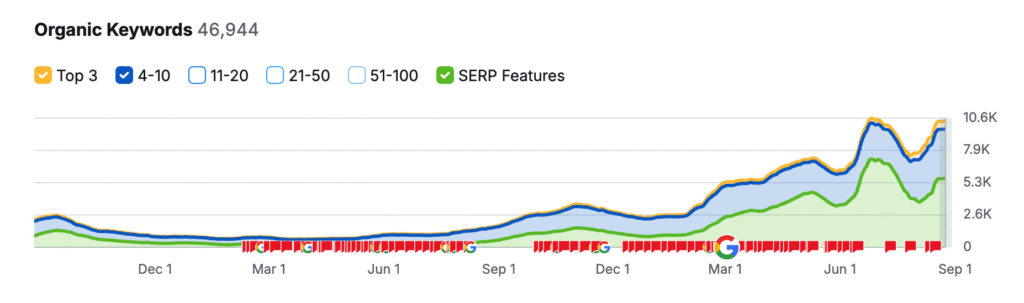 Thanks to our approach and expertise, organic keywords in the Top 3, throughout Page 1 (4-10), and inside SERP Features have seen a dramatic increase, helping organic traffic spike from 9,000 new organic users per month to now over 60,000 (and counting).