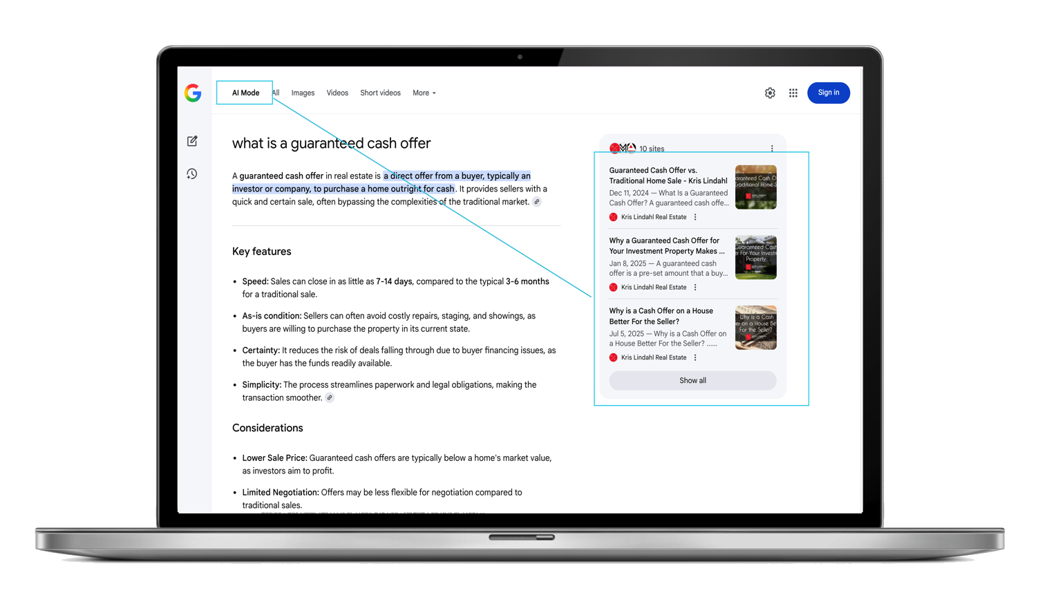 When work started on KL.com, the website was already attracting 9,000 organic users per month—a very strong starting point by real estate SEO standards. Early-on, we focused on restructuring and optimizing landing page components and blog content to align with the Sierra Interactive framework. Next, we continued to leverage IDX data in strategic intervals, applied an optimal site architecture and internal linking structure to help maximize search engine crawl-ability and user clickthrough rate, and implemented a highly-optimized content strategy that satisfies both traditional and AI search guidelines.